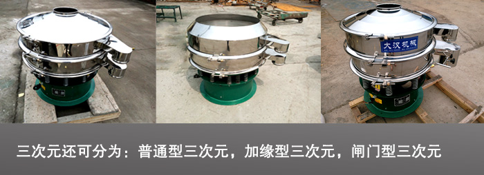 三次元震動篩是一種高精度細粉篩分設備,適用于粒,粉,粘液等物料的篩分。而三次元振動篩其工作原理于旋振篩大致相同,其不同的是三次元還可分為:普通型三次元,閘門型三次元,加緣型三次元。此振動篩也可以多層篩分。