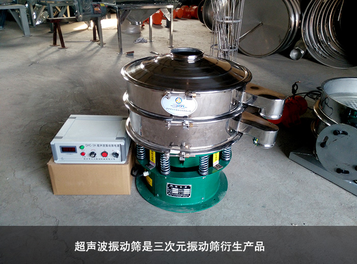超聲波震動篩是三次元振動篩衍生產品,它是在普通的三次元振動篩 的篩網加裝引入一個低振幅,高頻率的超聲波振動篩。此結構的改動很大程度上提高了其對微細粉的效率,并且還解決了物料因團聚,靜電,強吸附性而導致的堵網等難題。且此振動篩也能夠多層篩分。